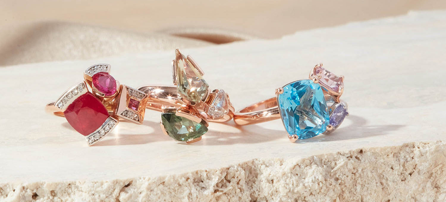 FAITH JEWELS' distinctive design style—a modern, linear interpretation of a floral arrangement. The design is bold and chic, punctuated by three key gemstones that together create the illusion of a vibrant, multi-hued bouquet.