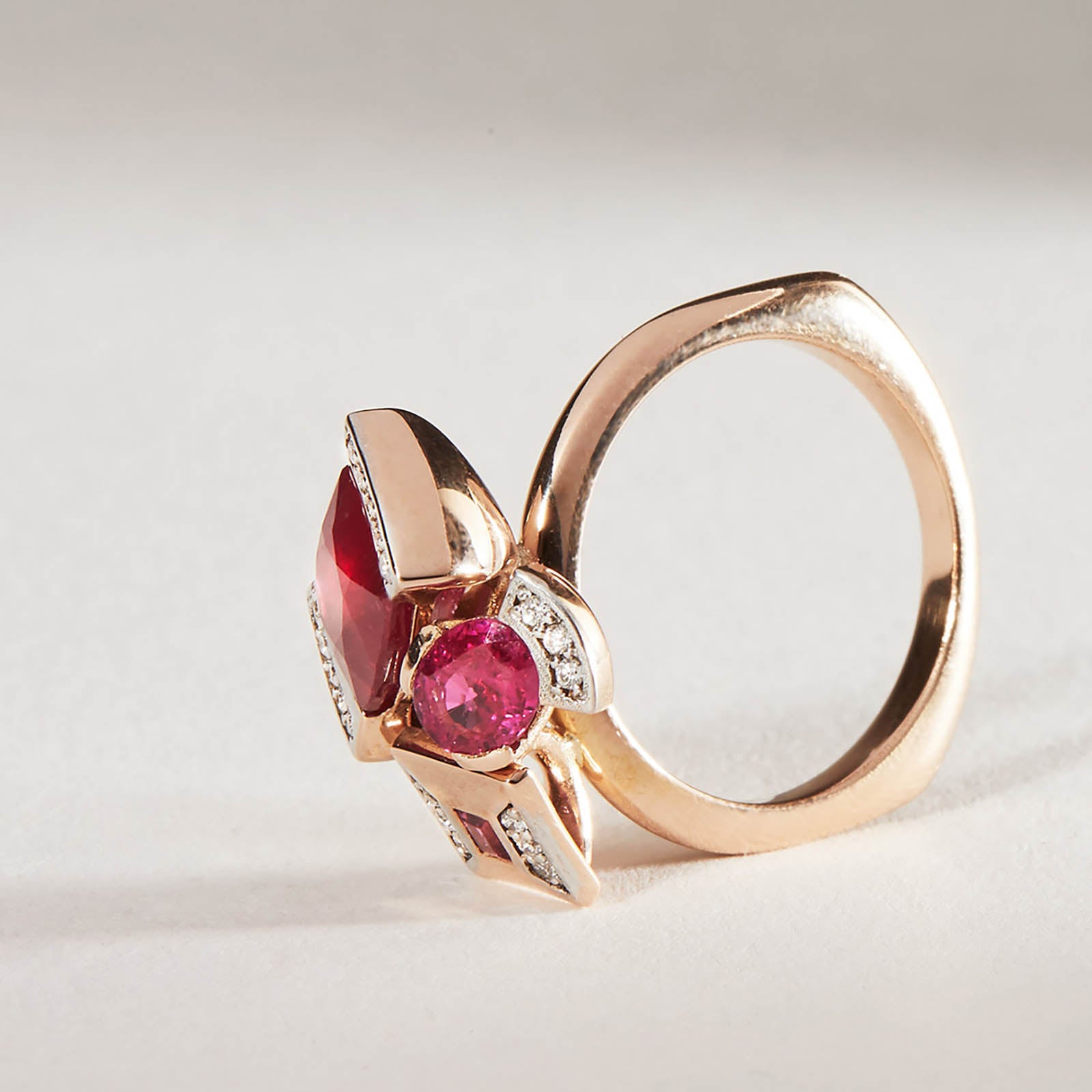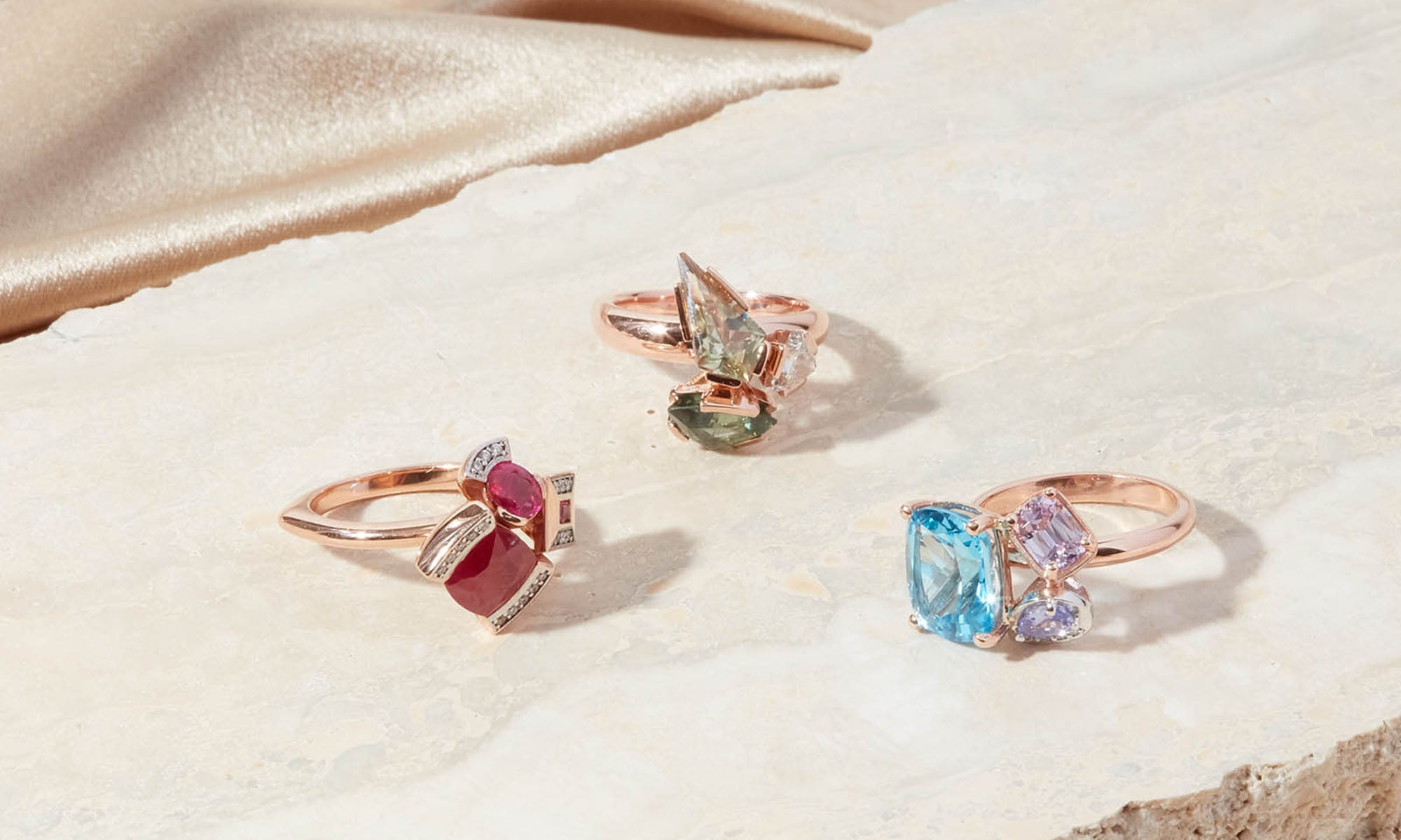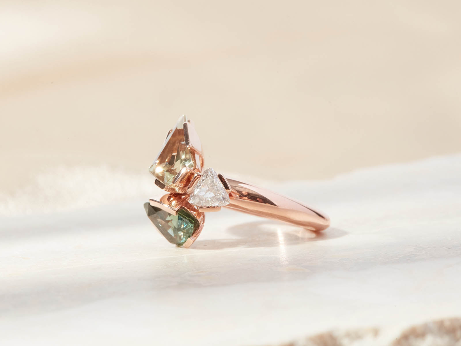 In a moment of inspiration sparked by a stunning bouquet of flowers, our Creative Director conceived a unique design, sketching a ring that combines three different colors and shapes within a single piece, diverging from the traditional approach of featuring a single gem across multiple jewels.